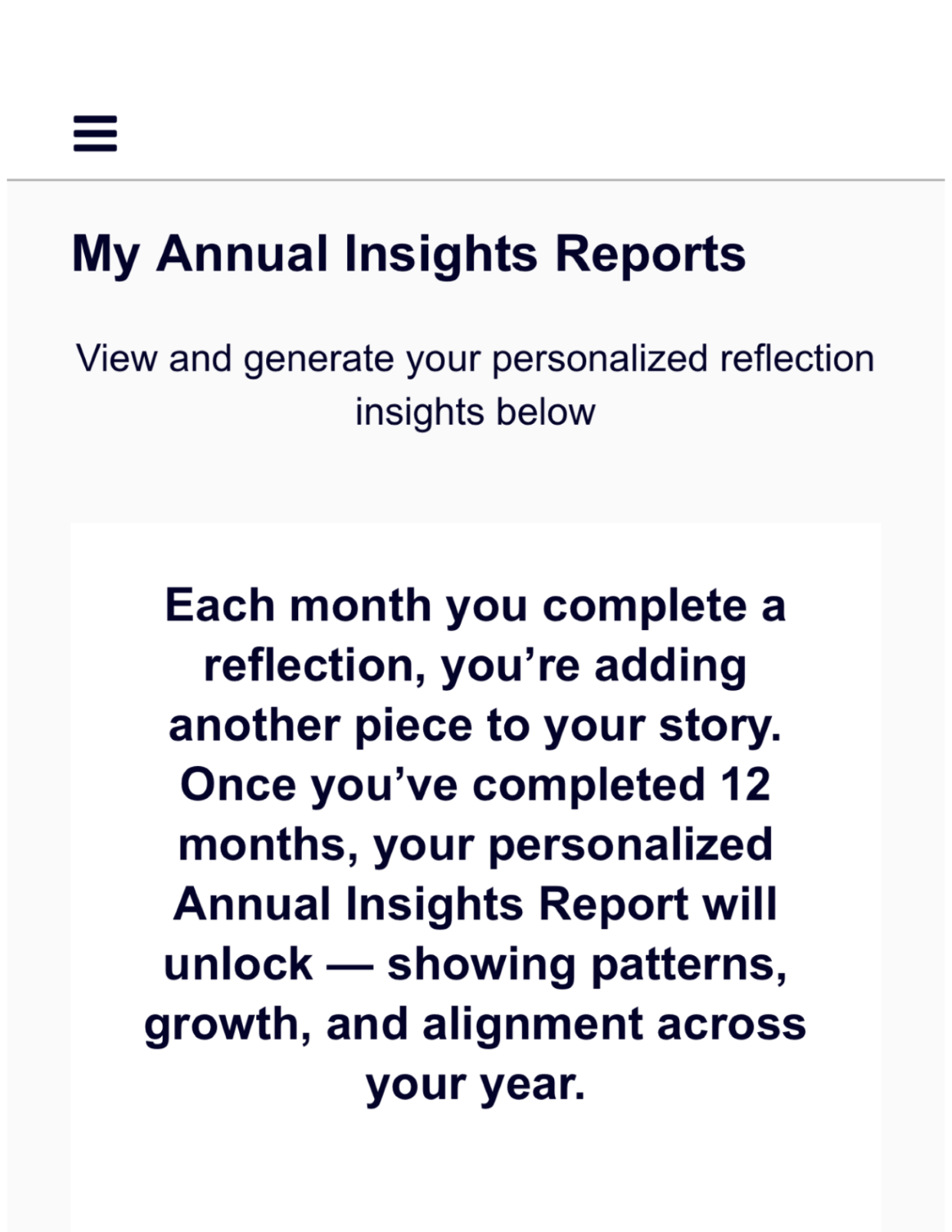 - After 12 months, generate your Annual Insights Report summarizing your journey